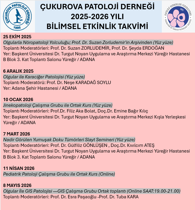 Değerli dernek üyelerimiz, Çukurova Patoloji Derneği 2025-2026 yılı bilimsel etkinlik programı yayınlandı.